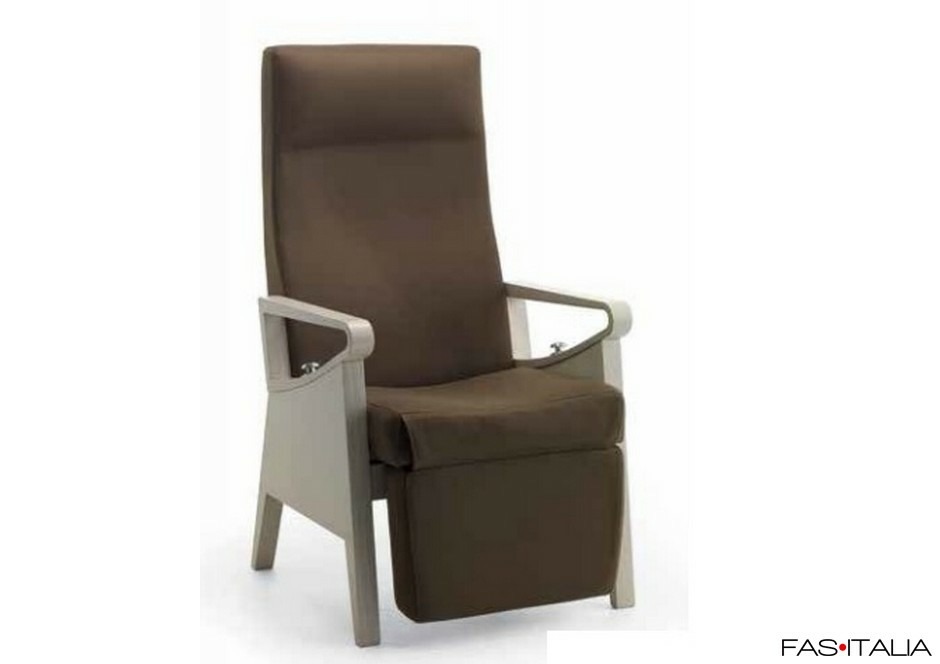 Una seduta che coniuga design e l'attenzione per l'ergonomia, il tutto arricchito dall'accuratezza delle finiture, la pulizia delle linee e la solidità della struttura in legno. Imbottitura in poliuretano espanso ignifugo (omologa ministeriale classe 1IM) Dotata di un facile meccanismo a gas, lo schienale assume diversi gradi di inclinazione, per scegliere quella più adatta alla posizione desiderata. La collezione è completata dalla versione con poggiapiedi regolabile. Dimensioni da posizione normale/distesa : L 54 x P 74/150 x H120/88 cm. Peso Kg 29.